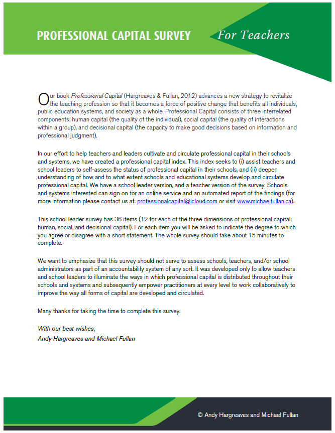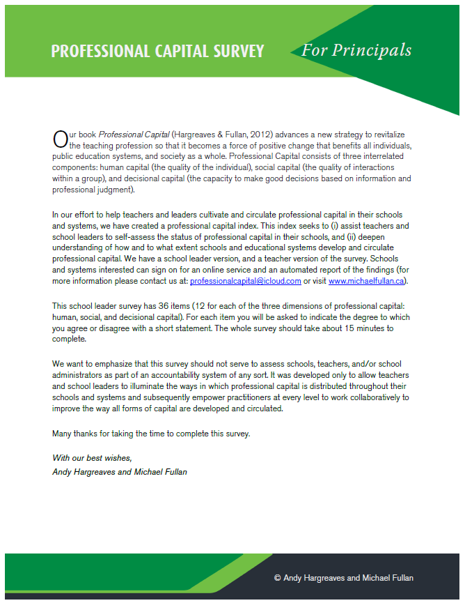 The Professional Capital Survey was originally designed as an online tool to measure dimensions of professional capital in schools. While the online platform and reporting services are no longer in operation, we are pleased to continue sharing: